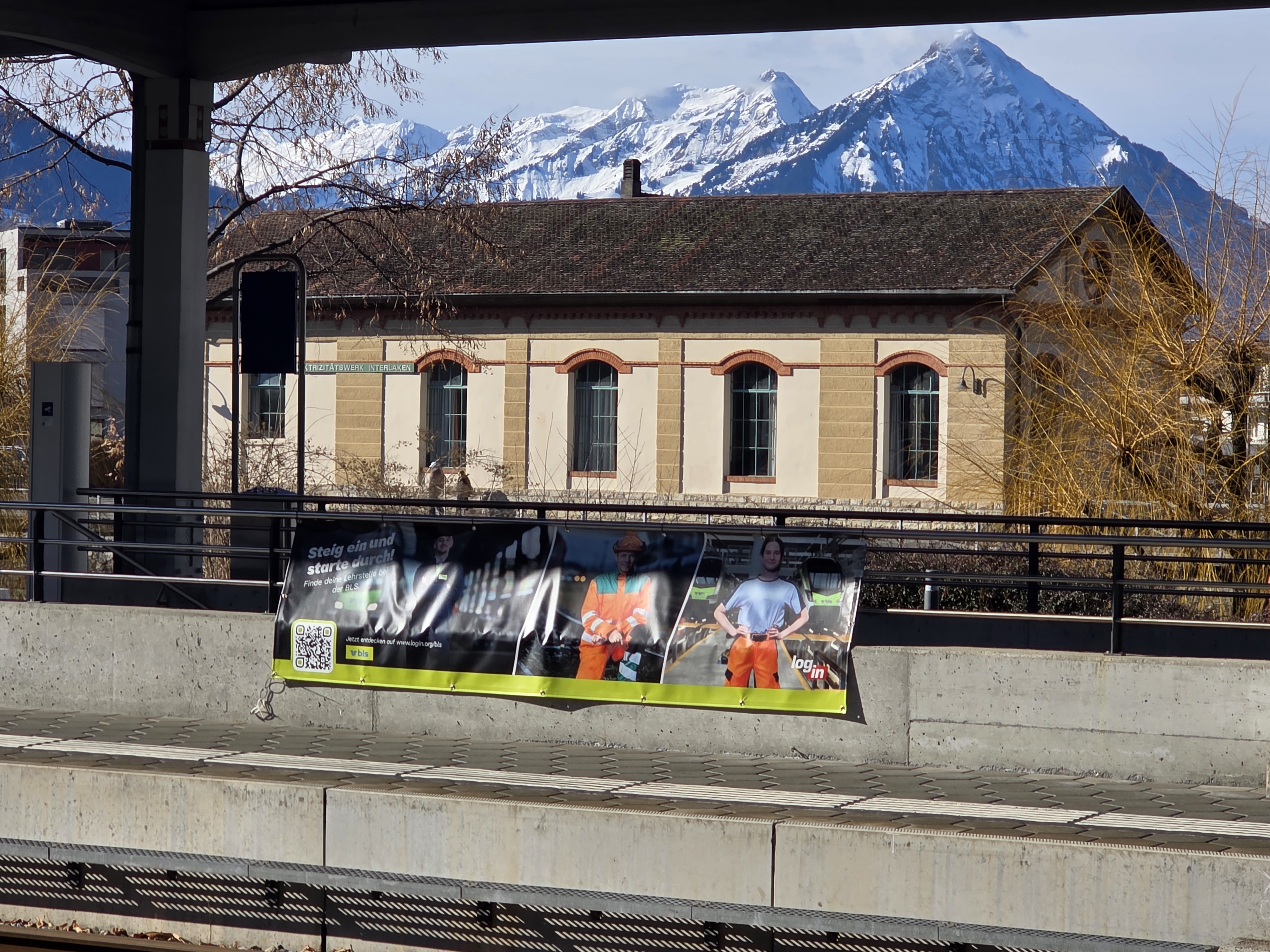 인터라켄 웨스트 역 주변을 천천히 둘러보며, 멀리 보이는 산과 잔잔한 풍경을 눈에 담았다.